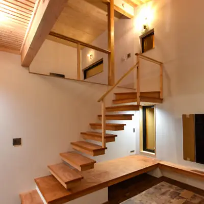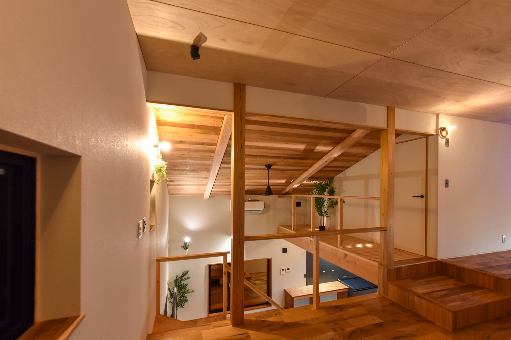 1階のフロアと、スキップフロアになっている2階フリースペースが、吹抜けを介して繋がっている事例です