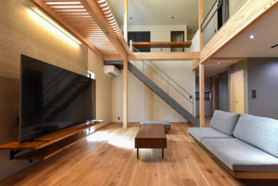 吹抜けを介して上下階が繋がる新築事例です