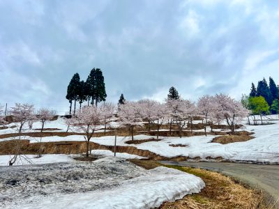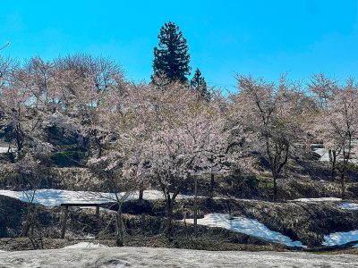 十日町市の大池という山の上の釣り場(最近では映画のロケ地にもなりました)があるのですが、そこを少し下ったところは雪と桜が一緒に楽しめる絶好のポイントでした。