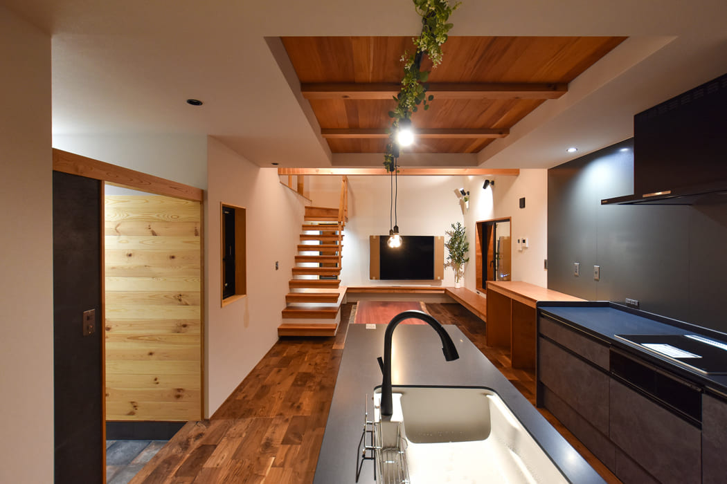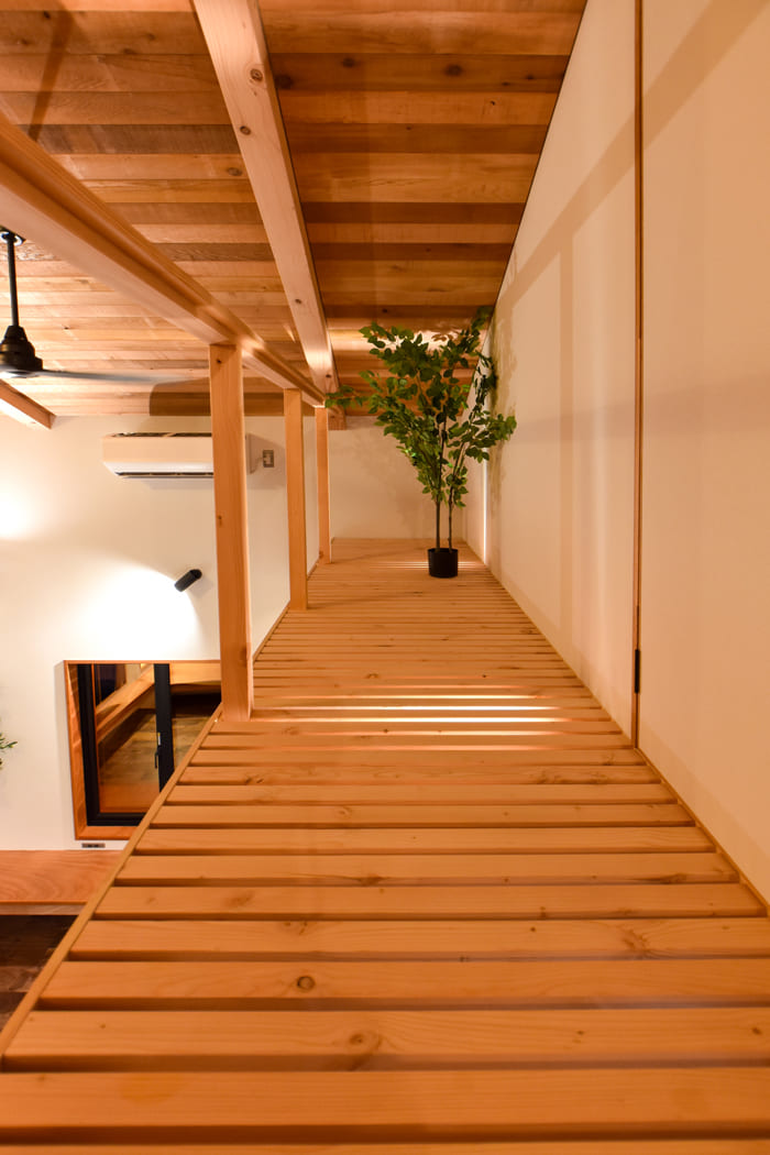 1階のフロアと、スキップフロアになっている2階フリースペースが、吹抜けを介して繋がっている事例です